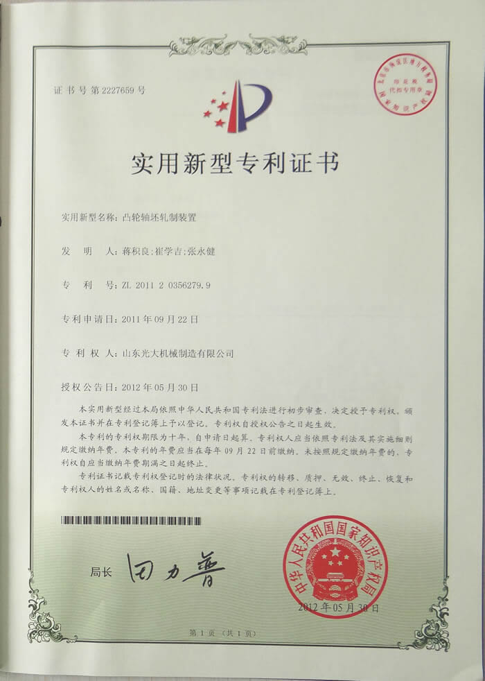Shell and tube type oil cooler - utility model patent certificate  Feeding device of cam shaft blank rolling machine - utility model patent certifi